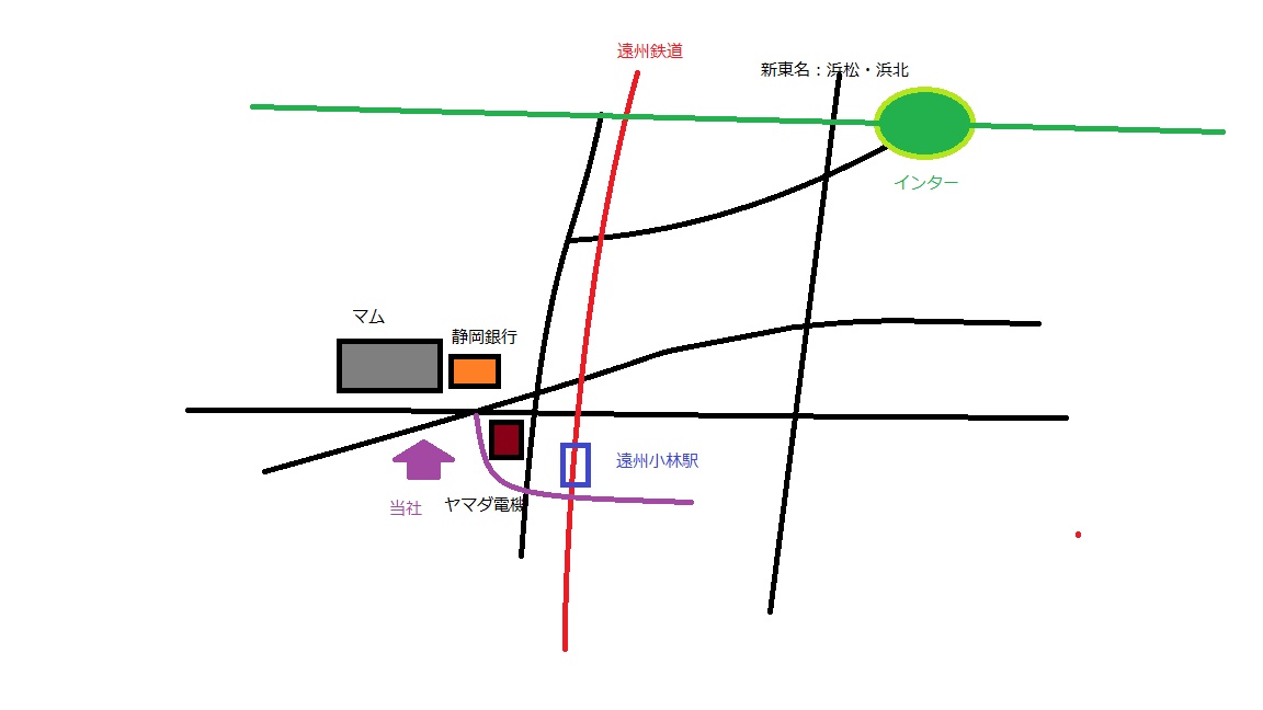 浜松方面に向かい、二俣街道に出たら南下。道沿いに5分ほどで、浜北大橋の道路との交差点に到着。交差点を右折して、ヤマダ電機を左、静岡銀行を右に見ながら、マムというスーパーマーケットを右に見つけたら、その道路を挟んだ反対側にあります。。